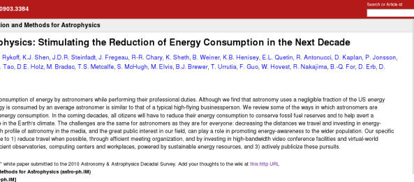 Astrophysics“, trying to become greener astronomers. One of the main steps is trying to reduce your carbon footprint by traveling less to remote locations. Driving a Prius, changing your light-bulbs and having a water efficient shower-head at home is all great, but it’s a bit moot as soon as you start traveling overseas regularly. There’s a wiki for this initiative, which unfortunately has not gotten much updates lately.